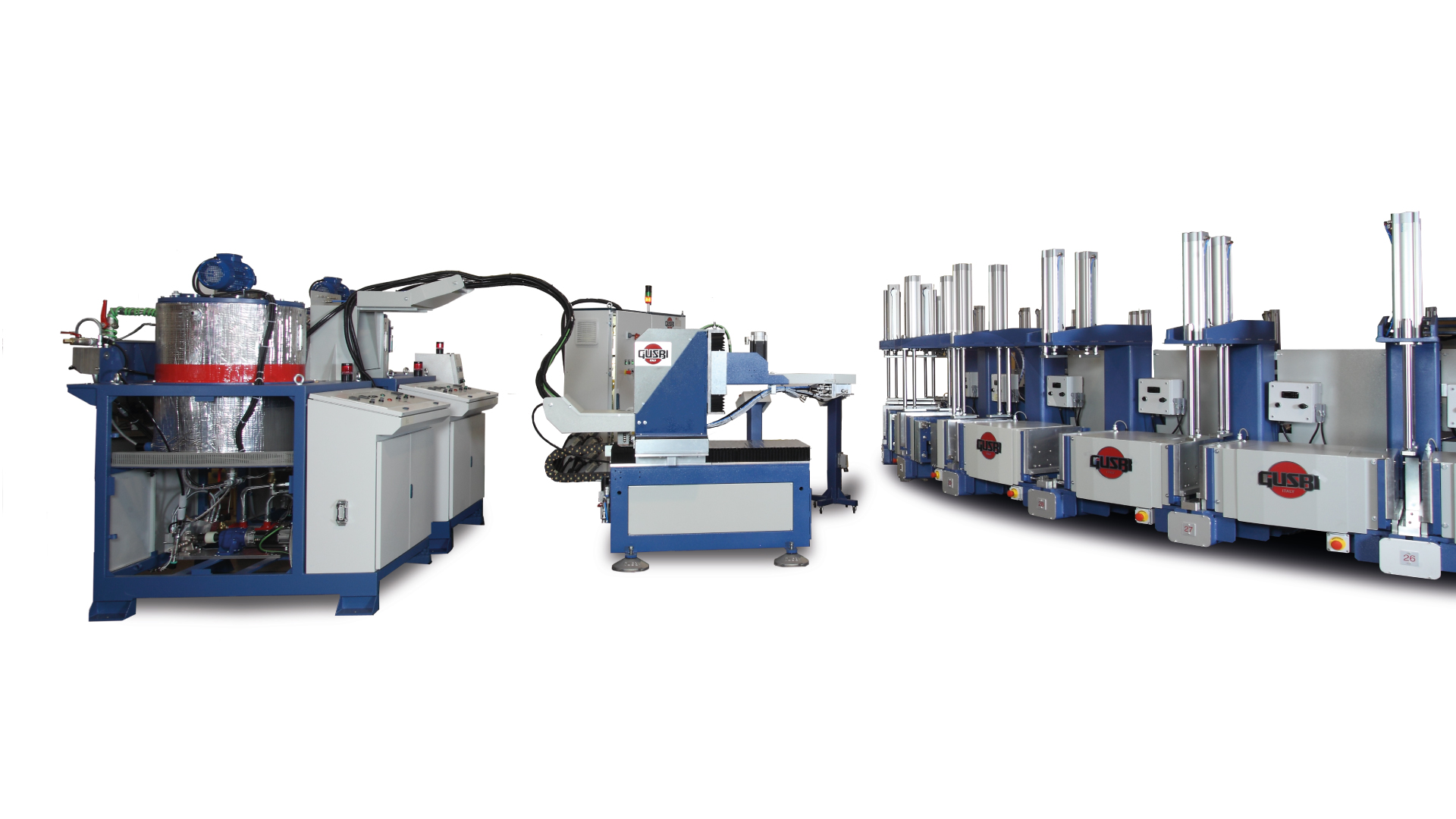 Macchine automatiche rotative, per lo stampaggio di fine corsa in P.U. monodensità, sistema iniezione, completo di dispositivo autopulente dell’iniettore. Disponibile a 12-18-24-30 stazioni singole.